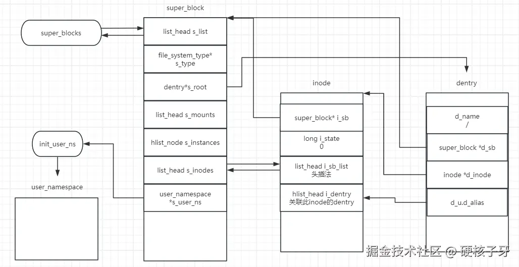 - 查看一个dentry对应的inode、超级块、文件系统