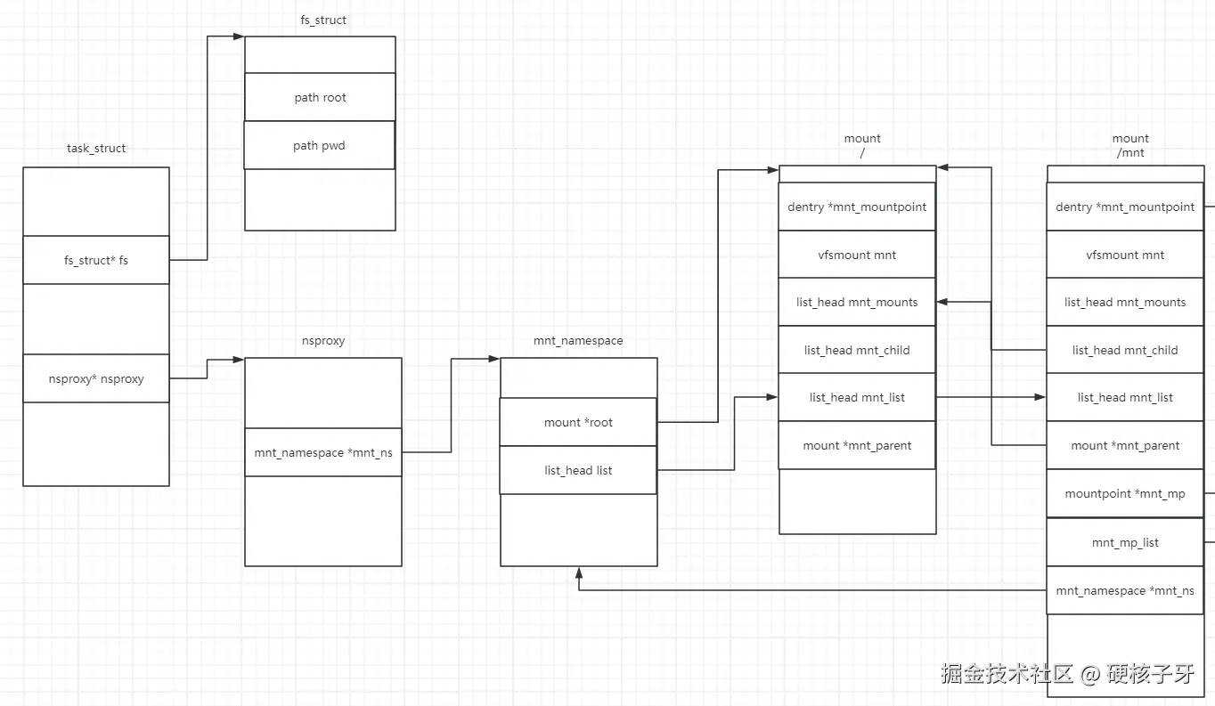 直接说结论,mount在Linux内核中做了很多事情,总结来说就是把进程task_struct、nsproxy、命名空间mnt_namespace、文件系统类型file_system_type、超级块super_block、目录项dentry、inode、mountpoint这些struct关联起来,你只需要搞清楚它们是如何关联的,mount你就算毕业了。本篇文章分享的就是这个