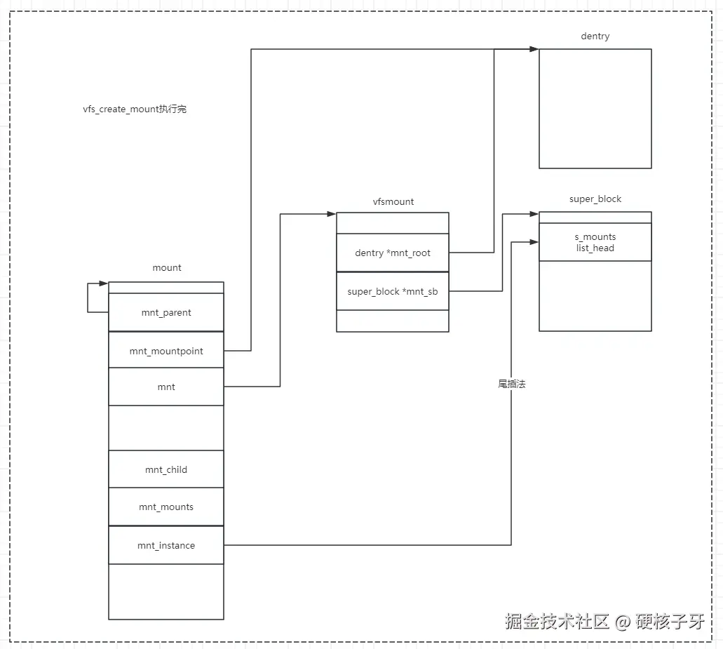 vfs_create_mount执行完后,mount、vfsmount、super_block、dentry之间的关系如下