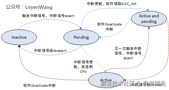 Inactive:无中断状态;Pending:硬件或软件触发了中断,但尚未传递到目标CPU,在电平触发模式下,产生中断的同时保持pending状态;Active:发生了中断并将其传递给目标CPU,并且目标CPU可以处理该中断;Active and pending:发生了中断并将其传递给目标CPU,同时发生了相同的中断并且该中断正在等待处理;