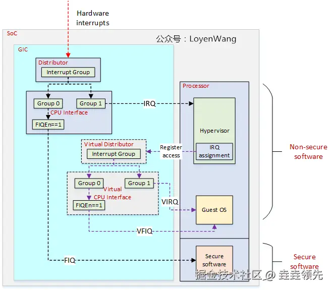 - 设置每个中断的Group:Group0或Group1,其中Group0用于安全中断,支持FIQ和IRQ,Group1用于非安全中断,只支持IRQ;