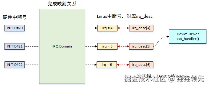 IRQ domain用于将硬件的中断号,转换成Linux系统中的中断号(virtual irq, virq),来张图: