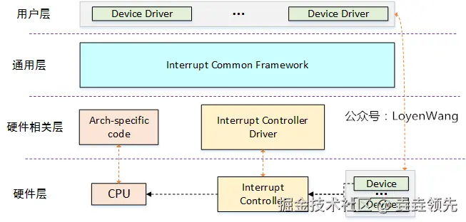 - 硬件相关层:这个层包括两部分代码,一部分是架构相关的,比如ARM64处理器处理中断相关,另一部分是中断控制器的驱动代码;