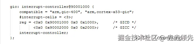 compatible字段:用于与具体的驱动来进行匹配,比如图片中arm, gic-400,可以根据这个名字去匹配对应的驱动程序;interrupt-cells字段:用于指定编码一个中断源所需要的单元个数,这个值为3。比如在外设在设备树中添加中断信号时,通常能看到类似interrupts = <0 23 4>;的信息,第一个单元0,表示的是中断类型(1:PPI,0:SPI),第二个单元23表示的是中断号,第三个单元4表示的是中断触发的类型;reg字段:描述中断控制器的地址信息以及地址范围,比如图片中分别制定了GIC Distributor(GICD)和GIC CPU Interface(GICC)的地址信息;interrupt-controller字段:表示该设备是一个中断控制器,外设可以连接在该中断控制器上;- 关于设备数的各个字段含义,详细可以参考