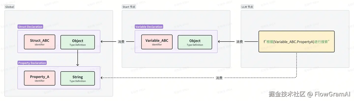Global 作用域 的 结构体声明 被 Start 节点消费, Start 节点的变量被 LLM 节点的 fString 表达式消费, LLM 节点通过下钻,实际消费了 Global 作用域中的 Property_A 声明