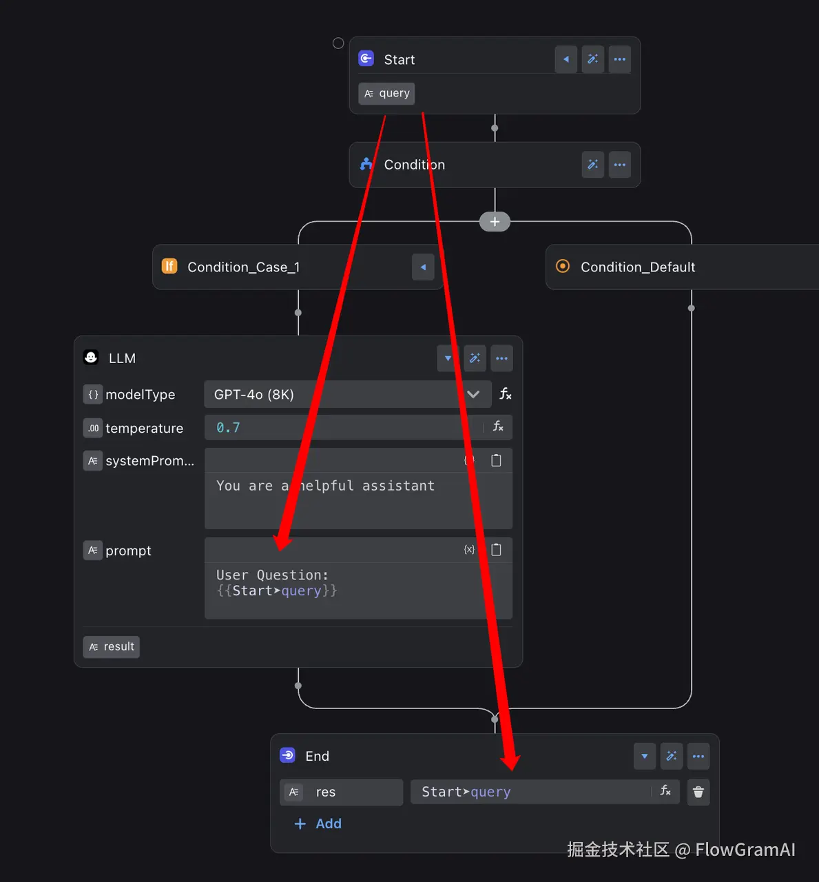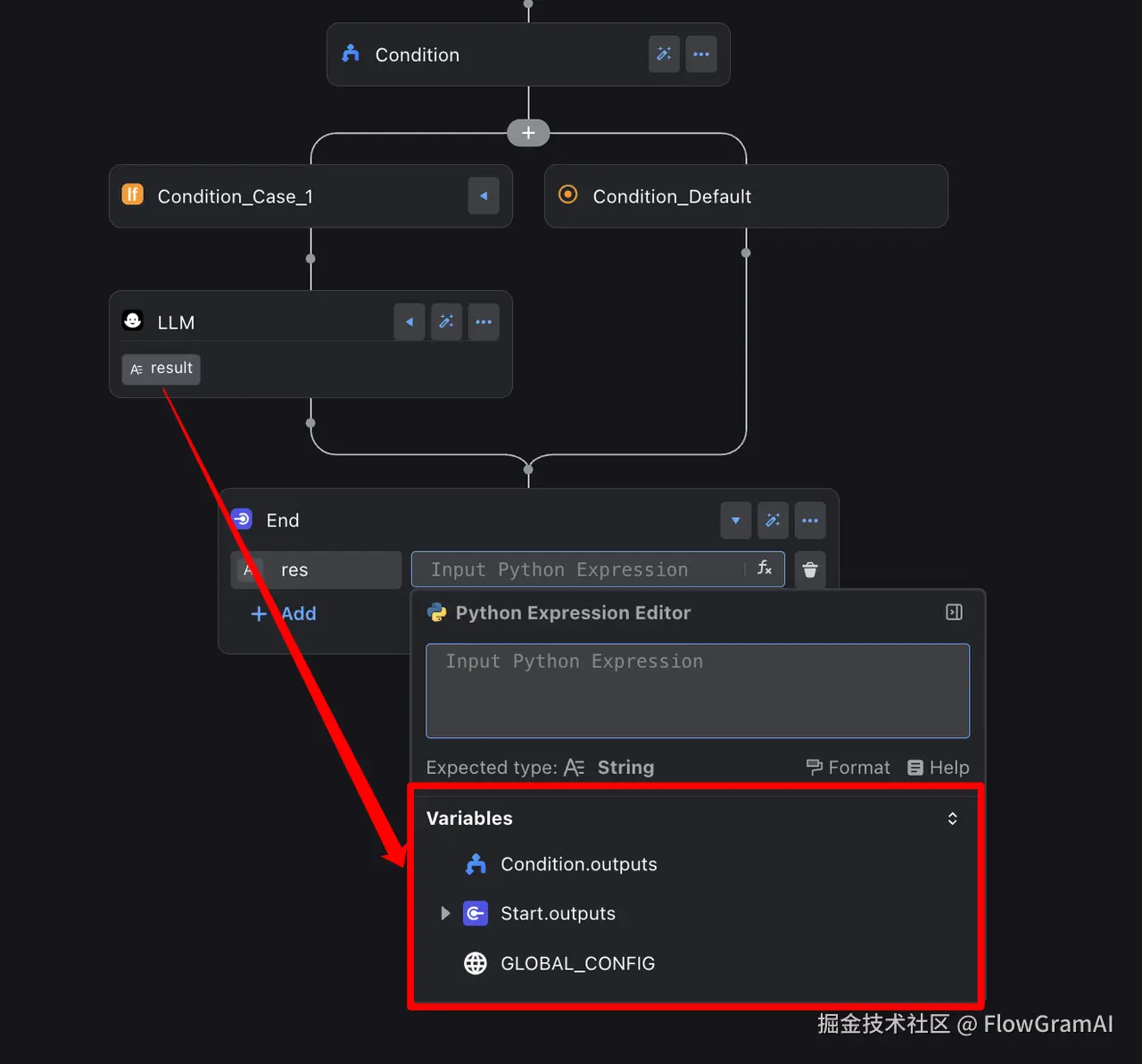LLM 节点在一个 Condition 分支里,像是在一个独立的房间。外面的 End 节点自然就拿不到它的 result 变量了。