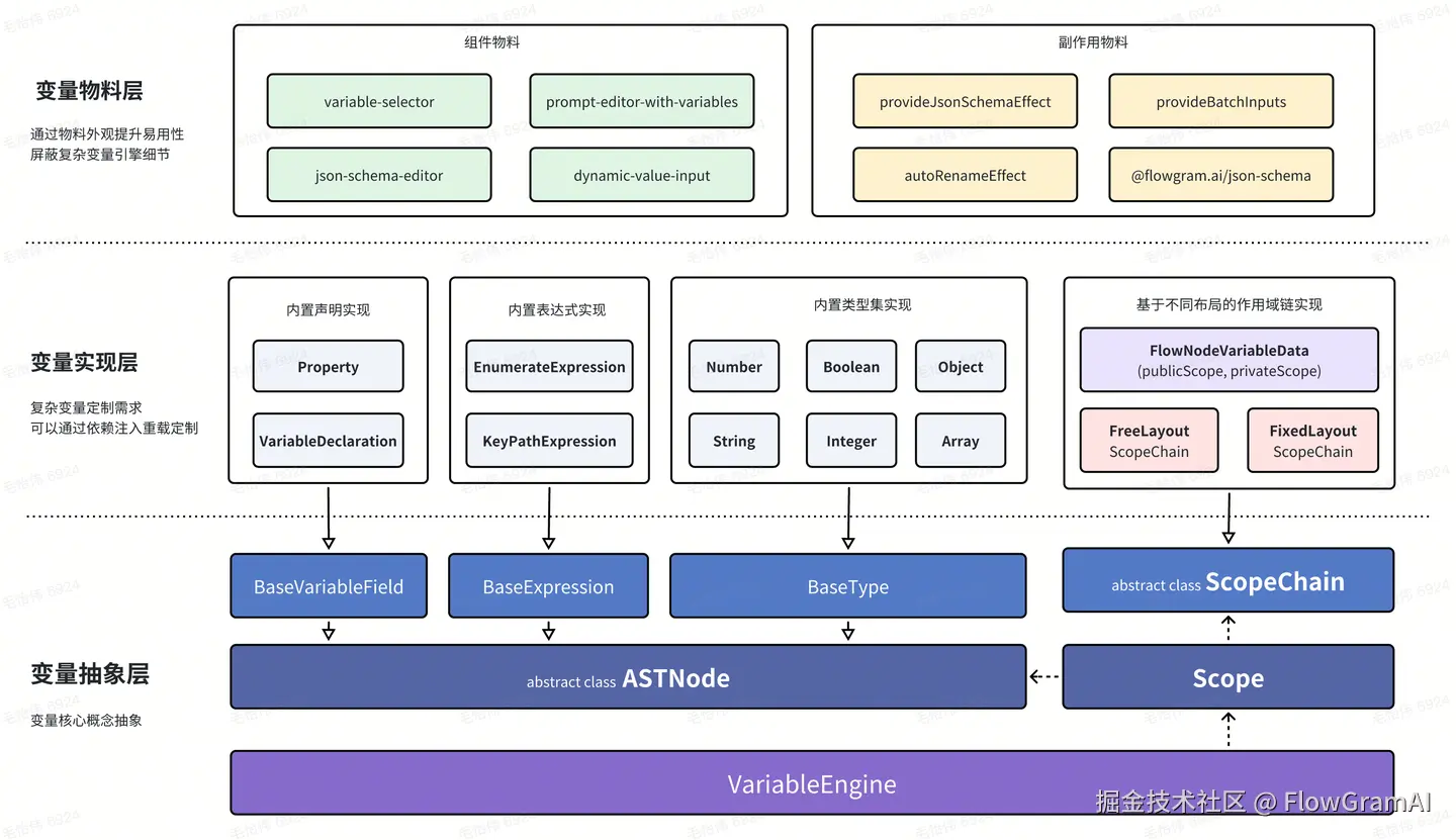 易用性和可扩展性的平衡一直是架构设计上一大难题。 flowgram 变量引擎通过三大分层架构兼顾了易用性和可扩展性: