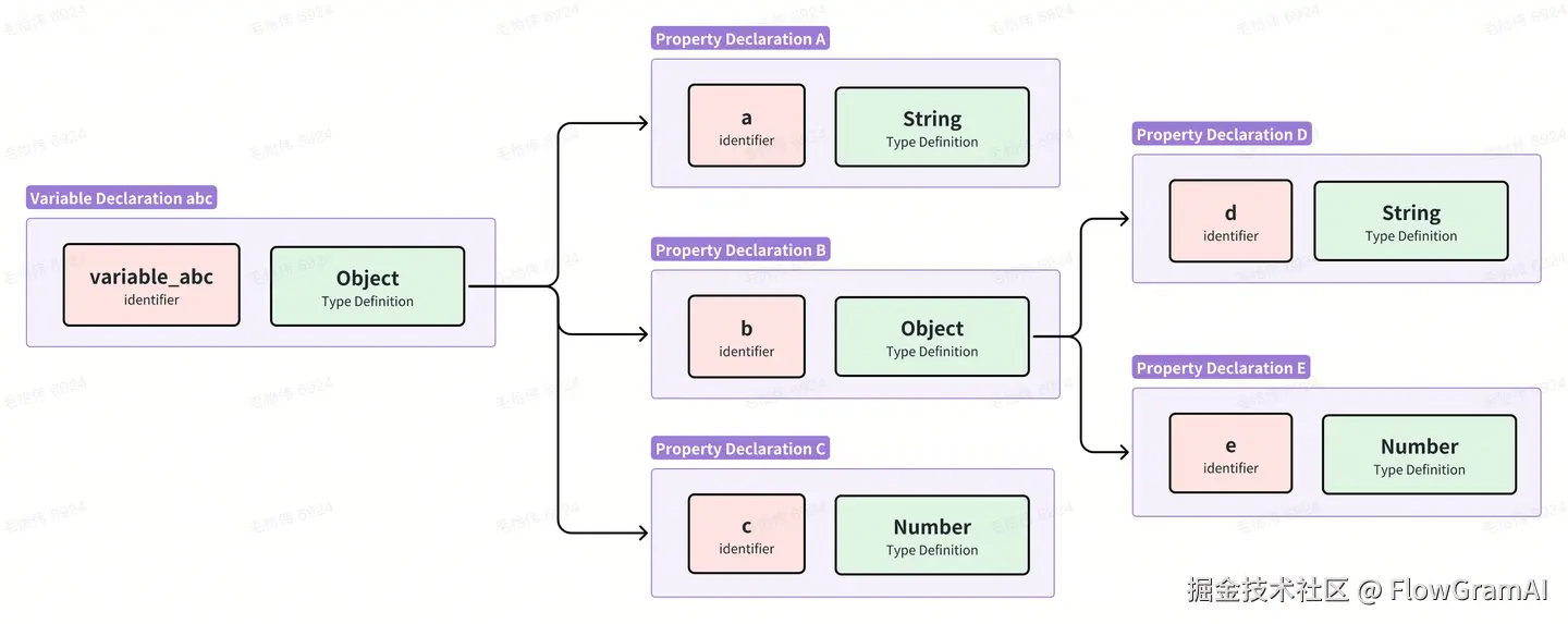 // 监听变量变化 variable.subscribe(() => { // do something }) // 监听变量的 Name 变化 variable.subscribe(() => { // do something }, { selector: (_v) => _v.meta.name }) // 监听变量类型变化 variable.onTypeChange(() => { // do something });参考 TypeScript AST 的定义,我们用 AST Schema 可以用来描述变量的 AST 信息: