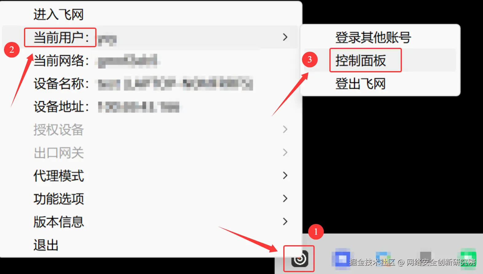 在你准备发送文件的设备上,在电脑右下方系统托盘里,点击飞网图标,点击“当前用户”,点击“控制面板”,进入飞网控制面板。