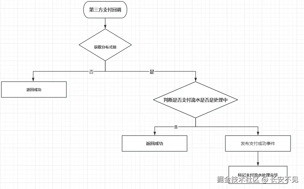 因此我们这里为了避免产生强烈的副作用,在回调下游的时候,先引入分布式锁,避免两个回调同时处理一笔流水,然后在处理的时候可以用查数据库,如下代码所示: