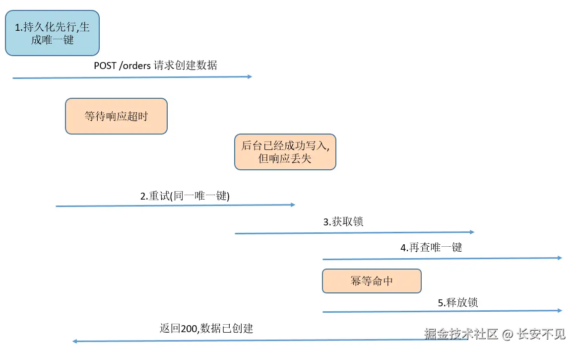在上面的场景中我们可以观察到,对于创建操作幂等的核心要义在于寻找唯一键和将唯一键进行持久化,唯一键的存在可以让我们在超过处理时间,第三方发起重试的时候,用做分布式锁的key,来避免这类重试。而持久化的动机则在于避免我们的确认消费消息在网络堵塞的情况下,超过调用方限制的超时时间,调用方发起重试。