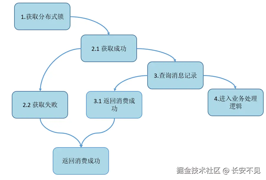 显然我们也需要避免这一点,那我们该怎么办呢? 我们可以从消息中选取唯一键,当作分布式锁的key,第二次重试的时候直接返回处理成功, 代码如下面所示:
