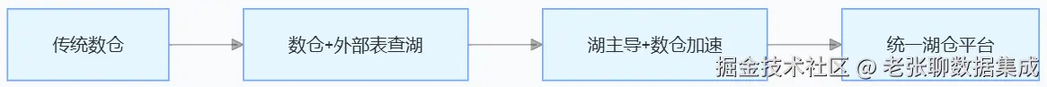 从传统数据仓库开始,先通过数仓连接外部表查询数据湖中的数据,逐渐过渡到以数据湖为主导,数据仓库作为加速层,最终实现统一的湖仓平台。