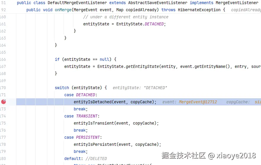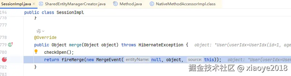 查询出了对象,因此走merge 分支,即使用代码中new 出来的对象覆盖 缓存中的对象。