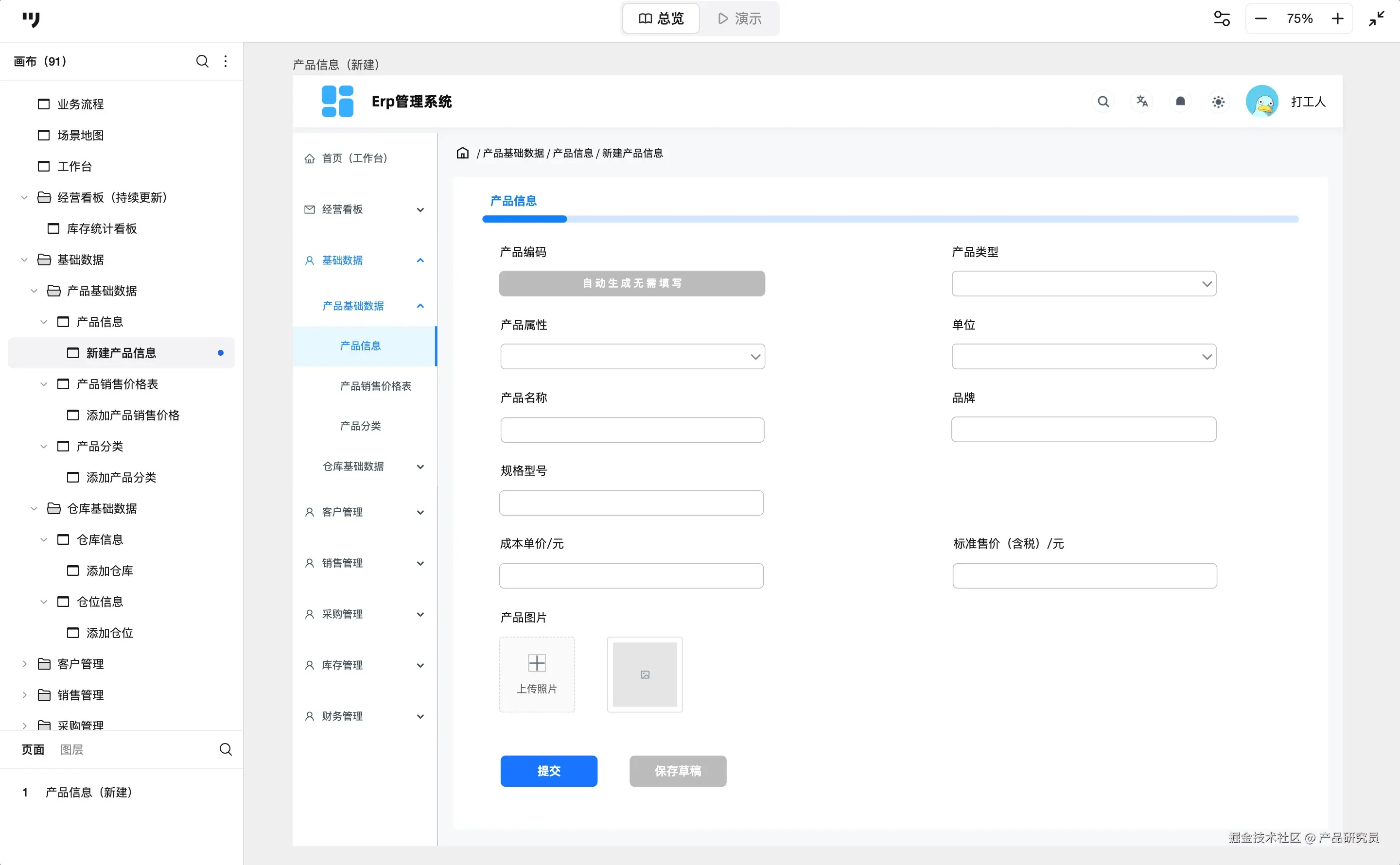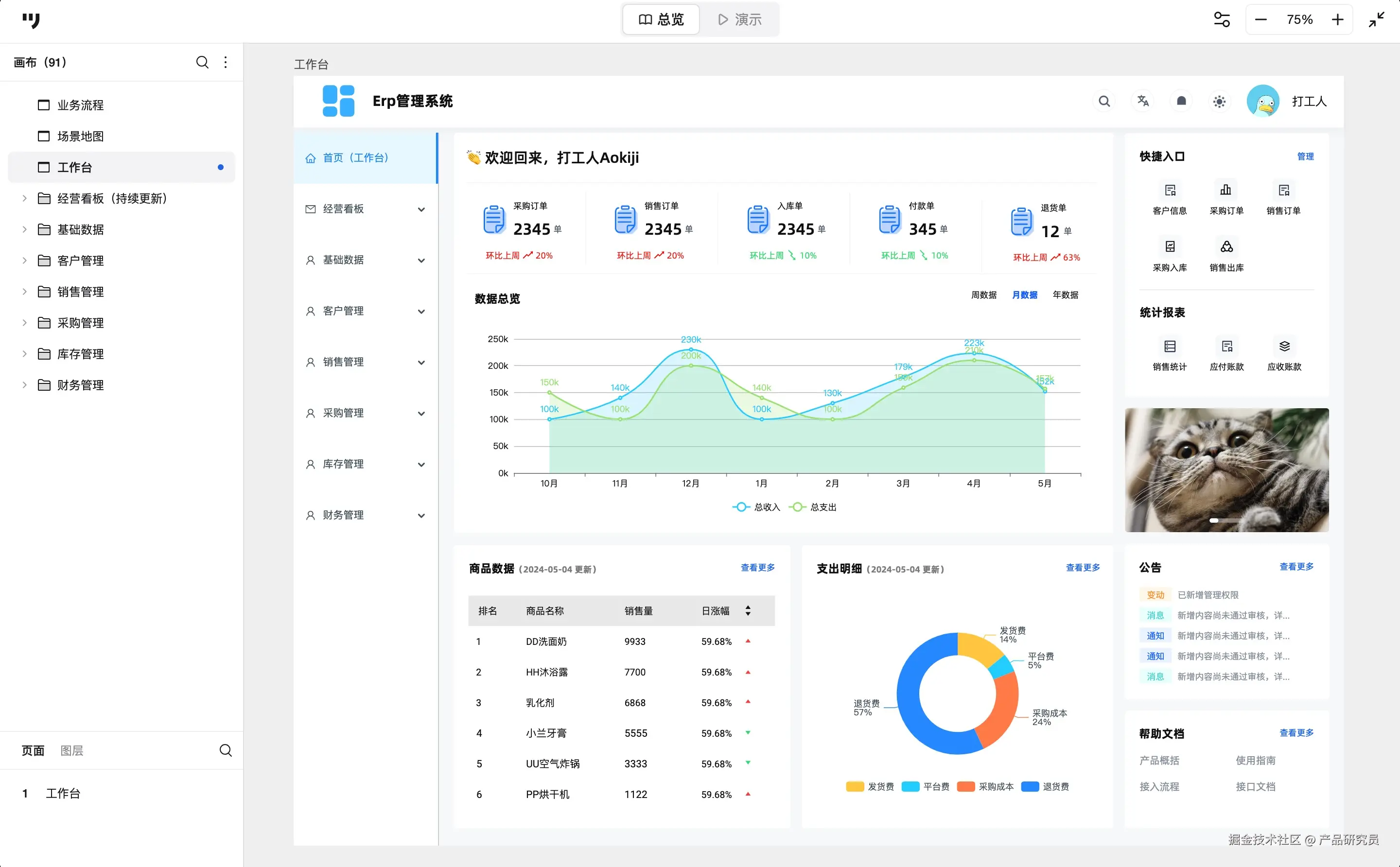 ERP进存销管理系统是企业经营管理的一个重要支撑,通常涵盖销售、采购、库存、财务等核心业务环节。本文结合墨刀素材广场中的一则ERP进存销管理系统原型案例,从设计思路梳理到页面功能拆解,分析其在原型设计中的要点,为产品经理在相关项目中提供参考与借鉴。