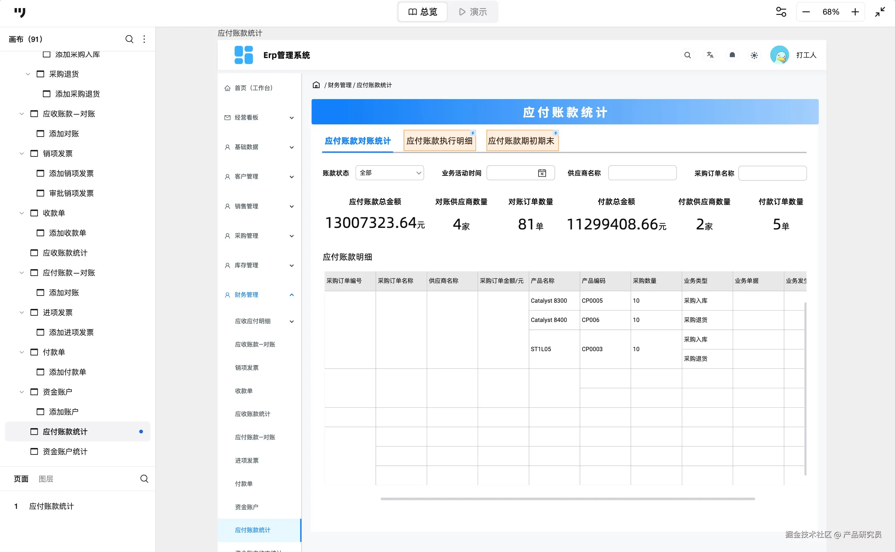 各类明细页面均采用筛选栏+信息列表的布局,既可查看详细信息,也支持添加与查看详情,这种布局虽然经典,但在这个案例中,筛选条件的维度设置得非常到位,考虑到了多业务角色的查询需求。在应付账款统计页面,延续统一的Tab分类布局,结合筛选栏、数据卡片和明细列表,不仅可以展示总体数据,还能快速查询具体明细,使统计结果直观清晰。