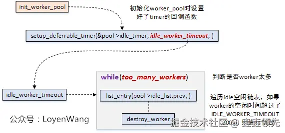worker_pool初始化时,注册了timer的回调函数,用于定时对空闲链表上的worker进行处理,如果worker太多,且空闲时间太长,超过了5分钟,那么就直接进行销毁处理了;