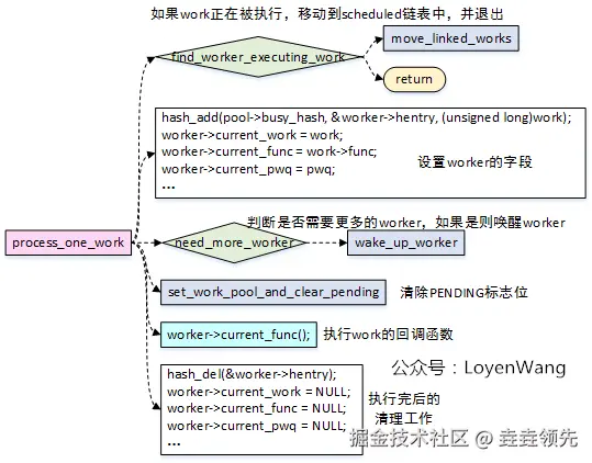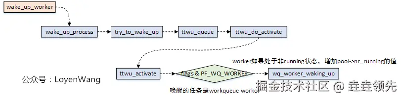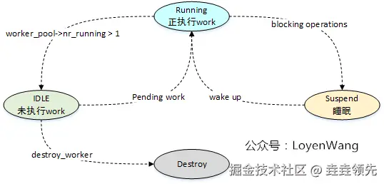 worker_pool的内核线程池时,如果有PENDING状态的work,并且发现没有正在运行的工作线程(worker_pool->nr_running == 0),唤醒空闲状态的内核线程,或者动态创建内核线程; - 如果