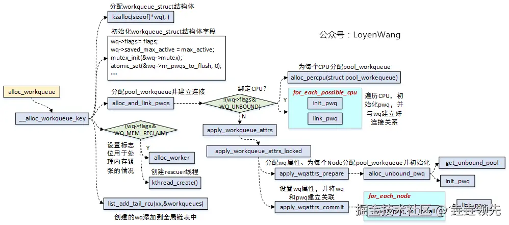 workqueue最终需要和worker_pool关联起来,而这个纽带就是pool_workqueue,alloc_and_link_pwqs函数就是完成这个功能:1)如果工作队列是绑定到CPU上的,则为每个CPU都分配pool_workqueue并且初始化,通过link_pwq将工作队列与pool_workqueue建立连接;2)如果工作队列不绑定到CPU上,则按内存节点(NUMA,参考之前内存管理的文章)来分配pool_workqueue,调用get_unbound_pool来实现,它会根据wq属性先去查找,如果没有找到相同的就创建一个新的pool_workqueue,并且添加到unbound_pool_hash哈希表中,最后也会调用link_pwq来建立连接; - 创建工作队列时,如果设置了