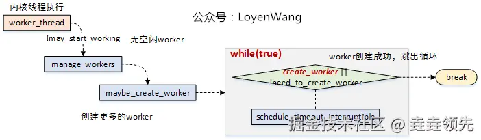 worker_thread函数时,如果没有空闲的worker,会调用manage_workers接口来创建更多的worker来处理工作;
