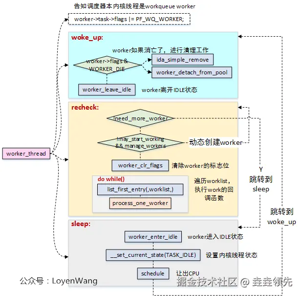 sleep部分比较好理解,没有任务处理时,worker进入空闲状态,并将当前的内核线程设置成睡眠状态,让出CPU; -