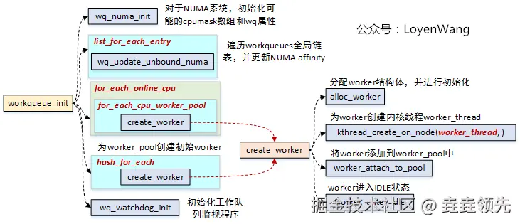 worker时,创建内核线程,执行函数为worker_thread; -