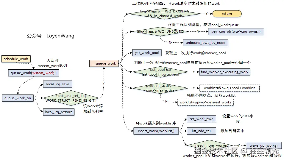 schedule_work完成的工作是将work添加到对应的链表中,而在添加的过程中,首先是需要确定pool_workqueue;pool_workqueue对应一个worker_pool,因此确定了pool_workqueue也就确定了worker_pool,进而可以将work添加到工作链表中;pool_workqueue的确定分为三种情况:1)bound类型的工作队列,直接根据CPU号获取;2)unbound类型的工作队列,根据node号获取,针对unbound类型工作队列,pool_workqueue的释放是异步执行的,需要判断refcnt的计数值,因此在获取pool_workqueue时可能要多次retry;3)根据缓存热度,优先选择正在被执行的worker_pool;