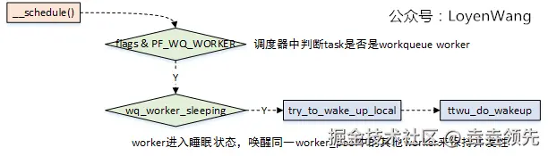worker_thread在开始执行时,设置标志位PF_WQ_WORKER,调度器在进行调度处理时会对task进行判断,针对workerqueue worker有特殊处理; -