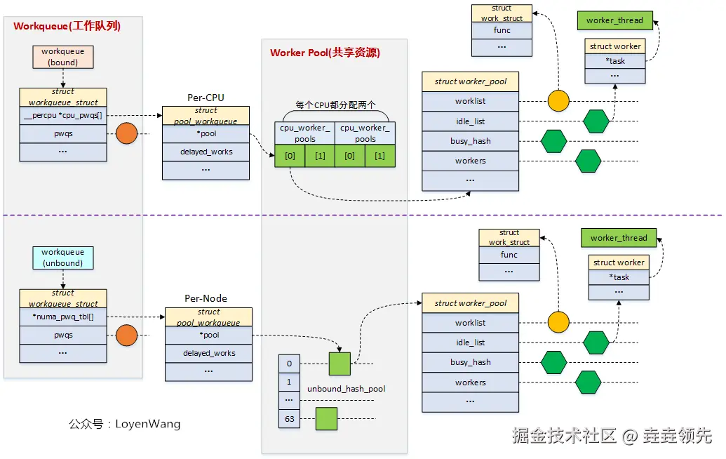 worker_pool是一个资源池,管理多个worker,也就是管理多个内核线程;- 针对绑定类型的工作队列,