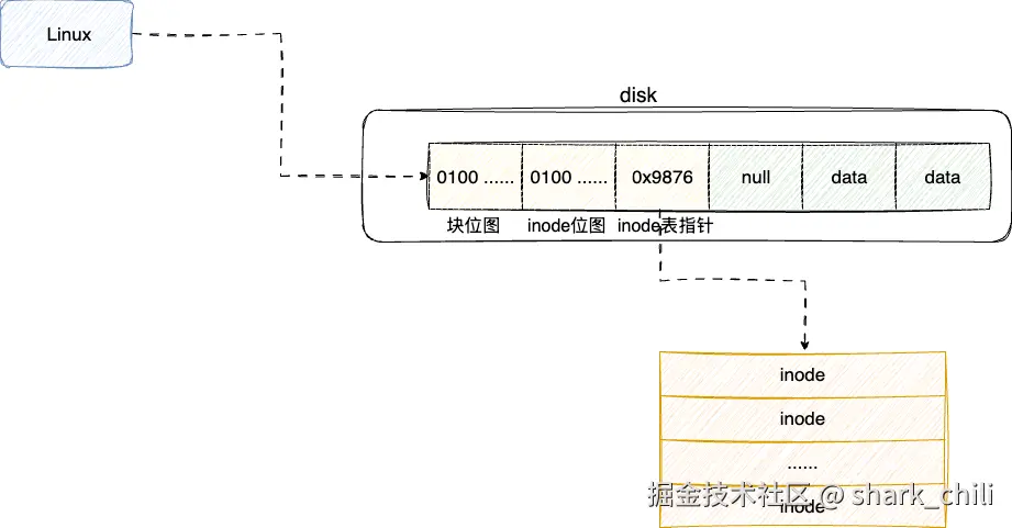 由此无数个文件就基于这些inode构成一张inode表,同时考虑到inode块定位的效率,在块位图之后又补充了一个inode块位图,同时也将inode表追加在inode块位图后面: