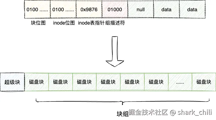 - 操作系统分为多分区,所以每个分区划分几个块组,并添加一个引导扇区作为操作系统安装引导程序的数据块