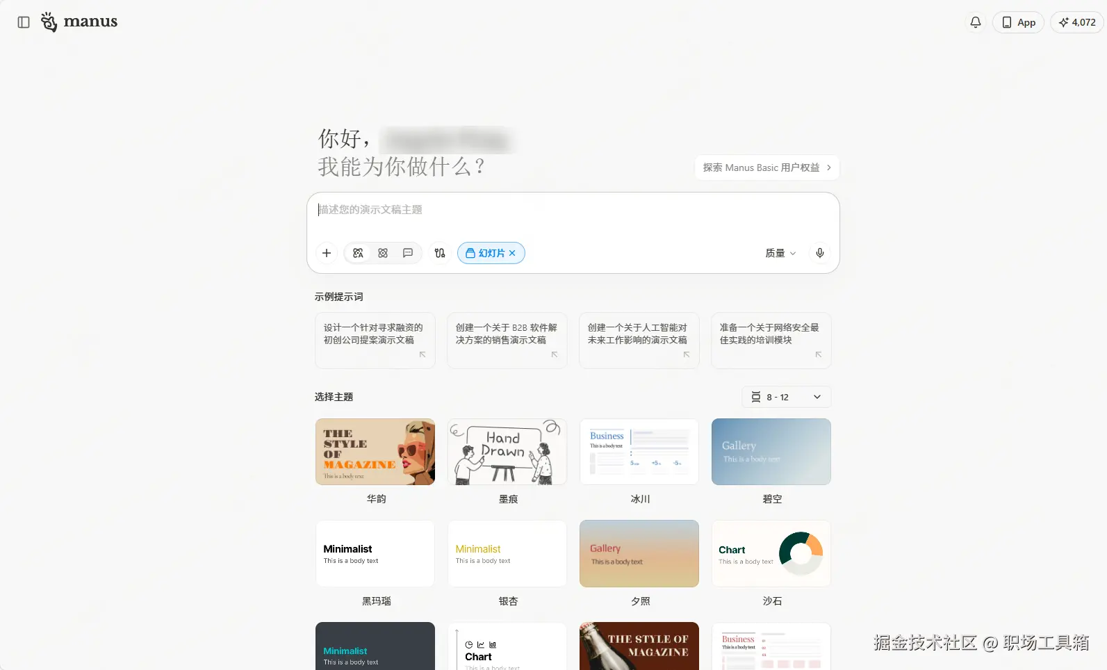 Manus PPT是通用Agent工具Manus为Basic及以上的用户提供的AI生成PPT工具,致力于为用户提供更加智能和个性化的演示文稿解决方案。它深度整合Manus本身的智能体,能基于用户输入的主题自行规划任务,联网检索相关的内容快速生成PPT,旨在帮助用户从繁琐的PPT制作中解放出来,专注于内容的表达和创新。