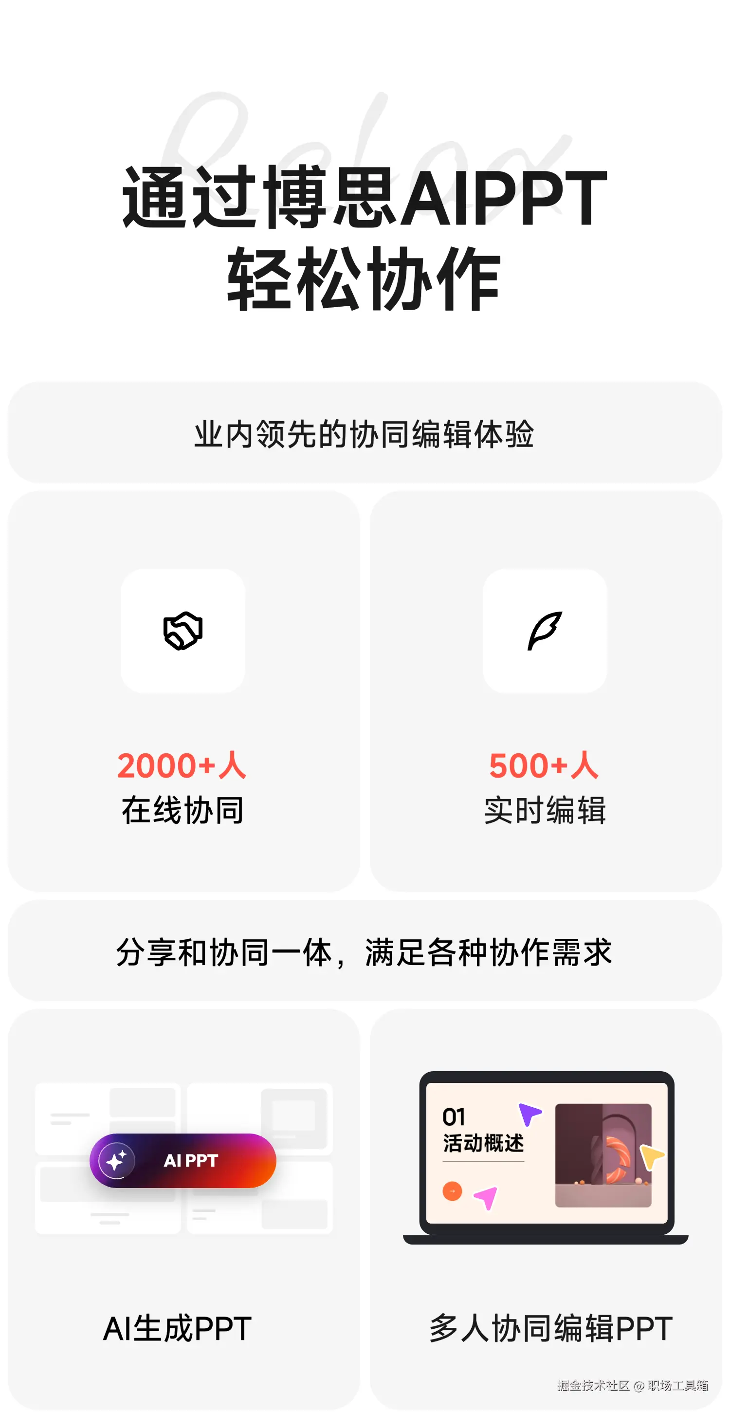 团队协作场景越来越常见,特别是在多地分布式办公成为常态的今天。多人同时编辑、实时反馈、版本管理等需求,对AI PPT工具提出了更高的要求。博思AIPPT在这方面的表现最为出色,支持上千人同时在线、500+人实时编辑,这在大型企业和组织中尤为重要。