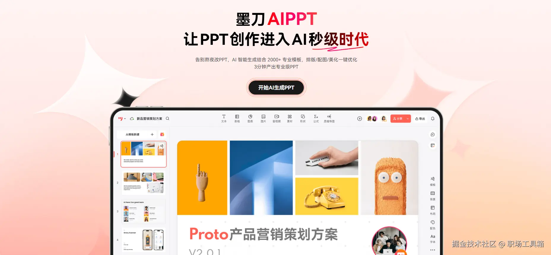 墨刀AIPPT是知名原型设计工具墨刀旗下的一款智能PPT产品。它将AI技术与墨刀在产品设计领域的积累相结合,为用户提供了高效、便捷的PPT制作体验。