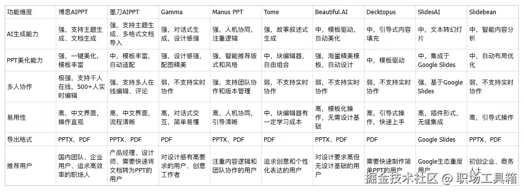 为了让你更直观地了解各款AI生成PPT软件的差异,我们从多个维度对它们进行了横向测评,希望能帮助你找到最适合自己的那一款。
