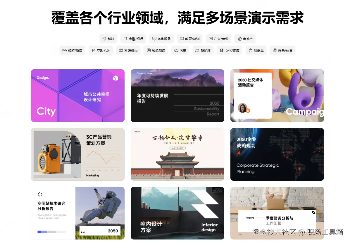 创意展示场景对PPT的视觉效果要求更高。设计师的作品集、广告创意提案、品牌发布会等场合,需要的不仅仅是信息传达,更要有视觉冲击力和艺术感染力。Gamma和BeautifulAI在这类场景中表现优异,它们的AI设计能力能够创造出令人印象深刻的视觉效果。