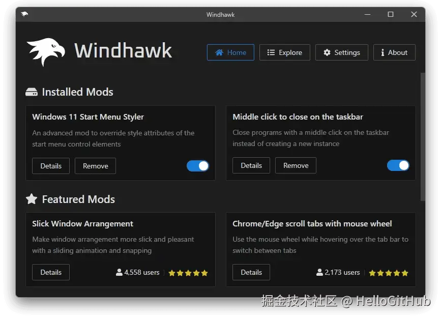 此外,一起看看本周 HelloGitHub 热评脱颖而出的开源项目,Windhawk 让 Windows 定制像装插件一样简单,OpenIsle 则是一个用 Java 构建的轻量级开源社区系统。