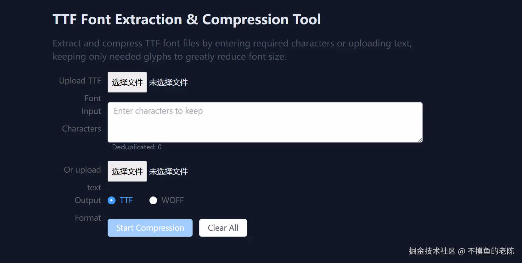 TTF Font Extraction & Compression Tool是一款字体处理工具,通过输入字符或上传文本,提取TTF字体文件中的所需字形,从而压缩字体大小。