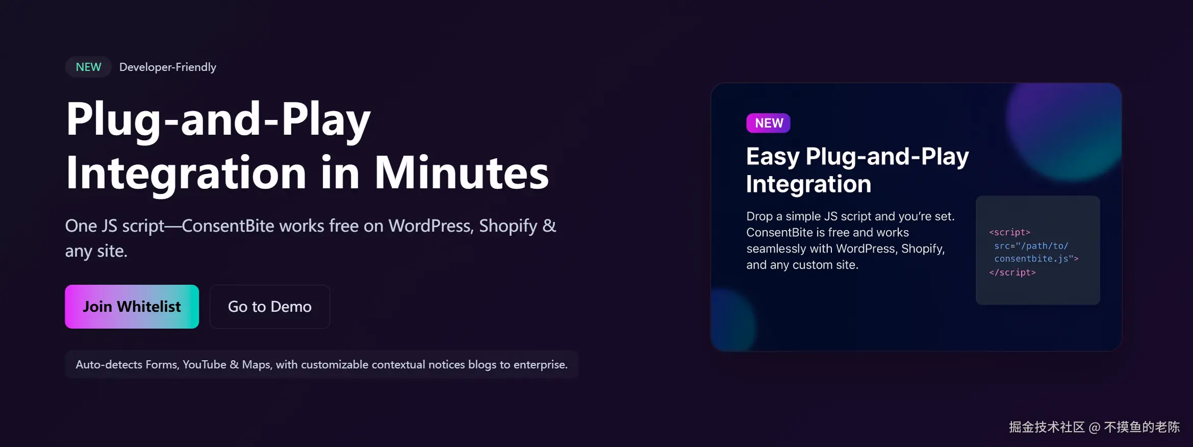 ConsentBite是一款上下文式Cookie同意工具,通过上下文通知替代传统的侵入式横幅,提升用户体验并确保GDPR/CCPA合规。