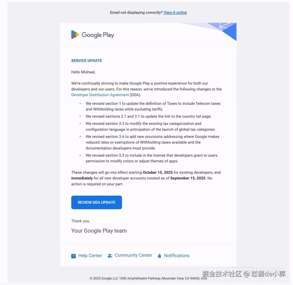 目前谷歌的公告还没有提及开发者是否可以选择退出此更改,但是谷歌已通过修改 Google Play 开发者分发协议 (DDA) 来通知用户,为了在 Google Play 上分发应用,开发者必须同意 DDA :