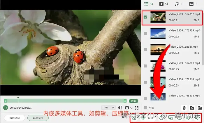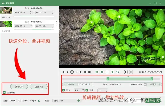 第3步:录完之后要是觉得有多余片段,想剪剪咋办?直接点软件里的 “高级剪辑” 就行!在这儿能把视频切成好几段,把没用的删掉、留下最想要的部分,还能加个转场特效啥的,让视频看着更顺溜。