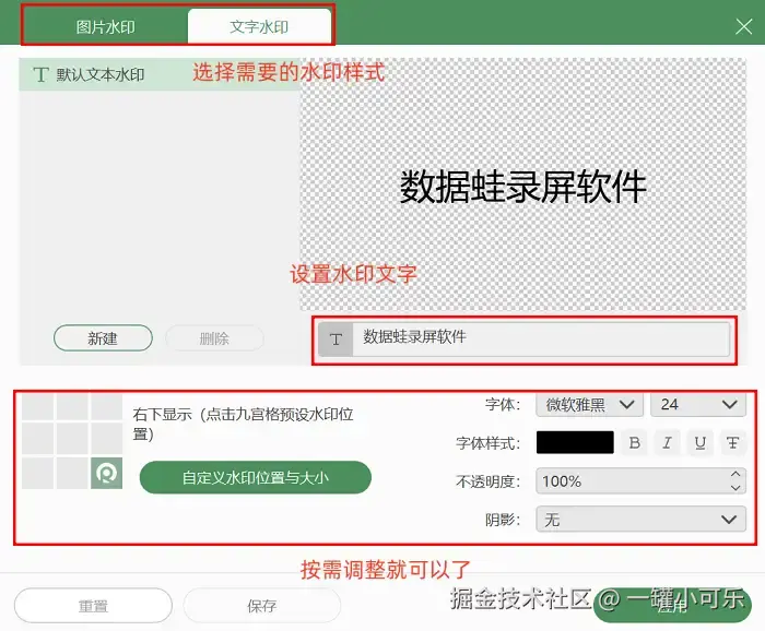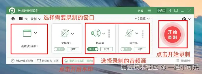 第2步:选好模式后就可以锁定录制的窗口了。对了,音频也得调,是只录电脑里的声音(比如视频音效、课件声音),还是连你麦克风的声音(比如你讲解的话)一起录,都能自己说了算。要是想给视频整个专属记号,直接点击下面的 “文字水印” 加上就行。等这些都弄好,点一下 “开始录制” ,这步就搞定啦!