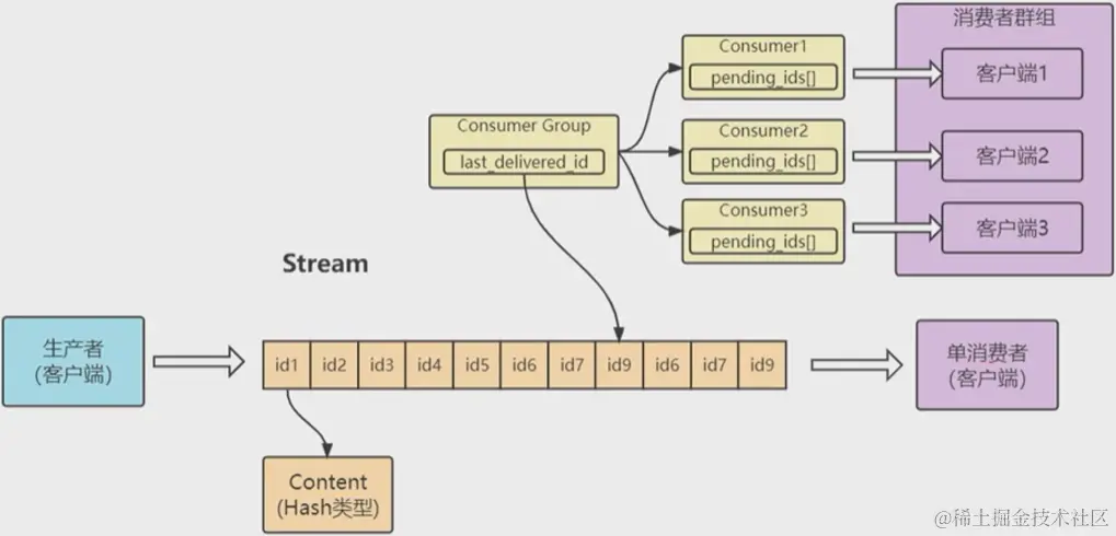 xadd key * k v k v... key : stream的key ***** :redis生成的ID k, v : Content 消息的内容(k, v 键值对)