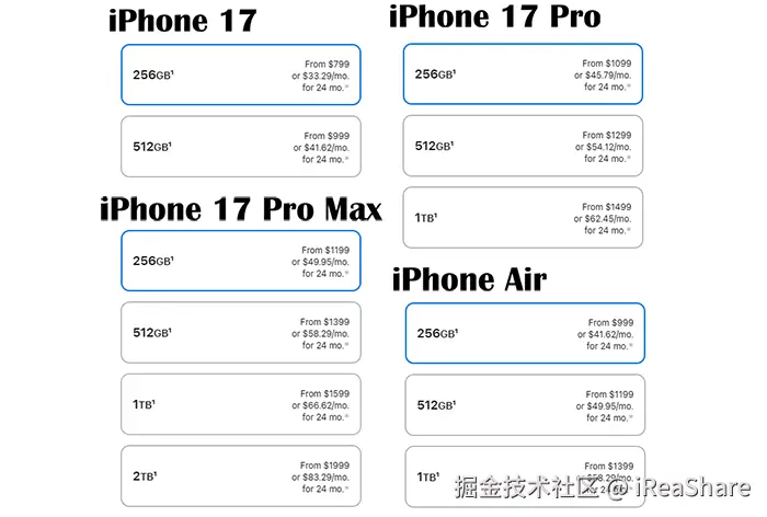 iPhone 17 系列:标准版 iPhone 17 起售价约为 799 美元,Pro 版起售价约为 1099 美元。更大尺寸的 iPhone 17 Pro Max 起售价为 1199 美元,轻薄版 iPhone Air 起售价为 999 美元。以上价格适用于基本款机型。