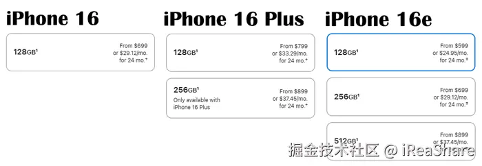 iPhone 16 系列:随着 17 系列的发布,iPhone 16 和 16 Plus 现已降价发售。iPhone 16 基本款起价约为 699 美元,iPhone 16 Plus 起价为 799 美元,iPhone 16e 起价为 599 美元。