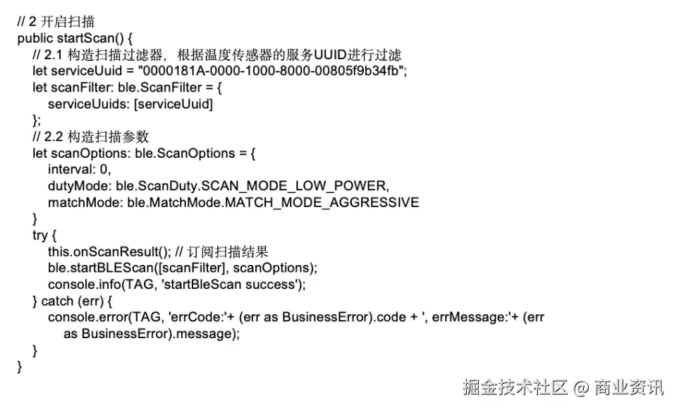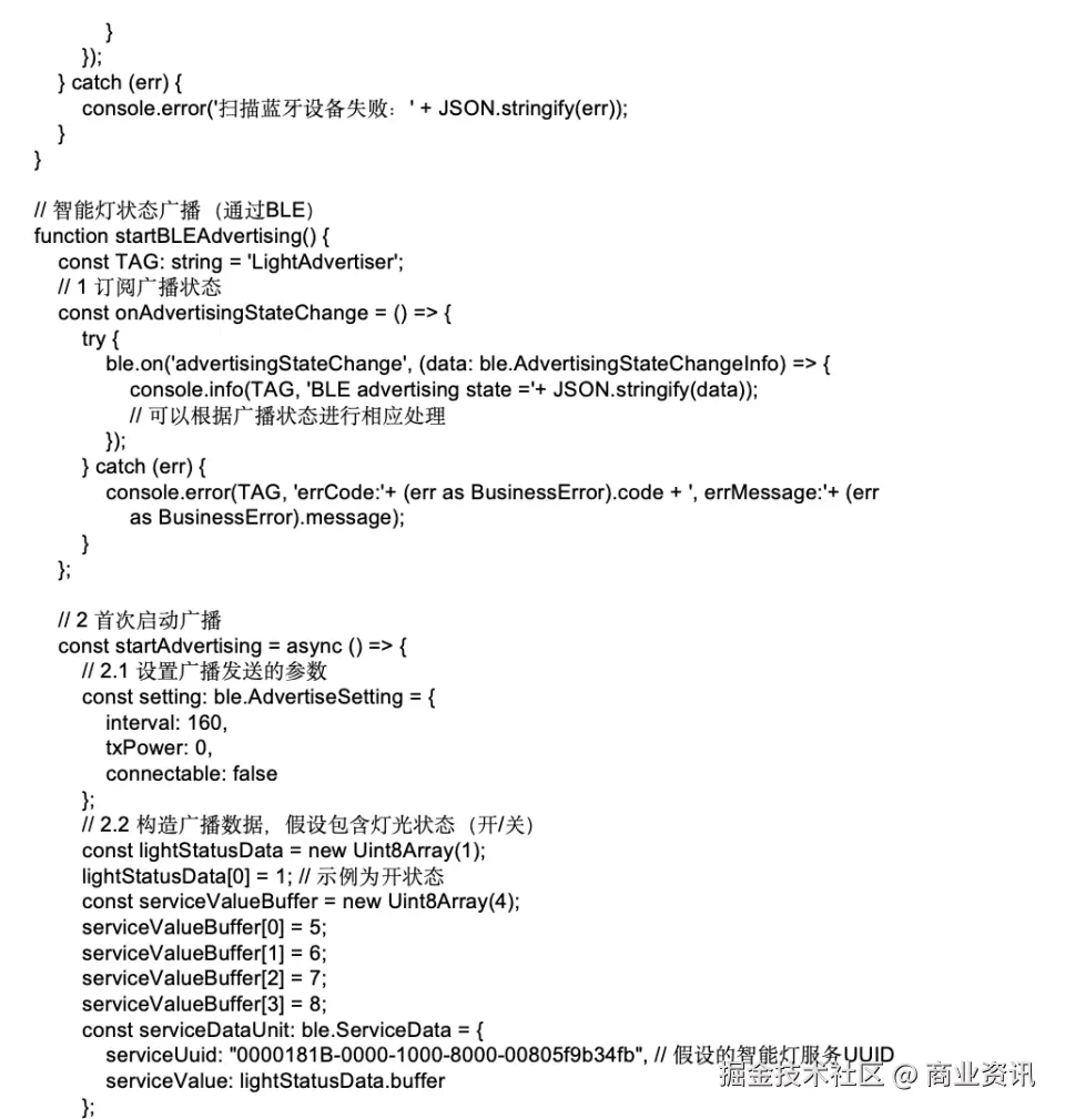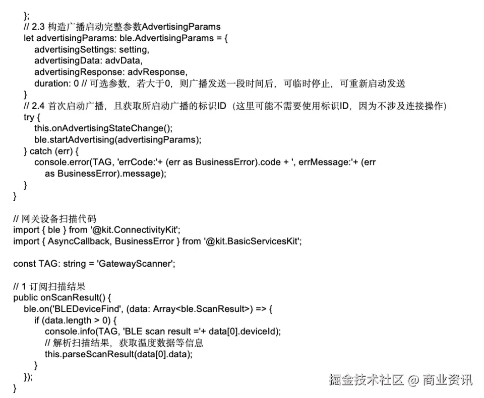 · 低功耗设备(如温控传感器)通过 BLE 广播自身状态信息,网关设备则开启 BLE 扫描,接收并处理这些信息。示例代码如下: