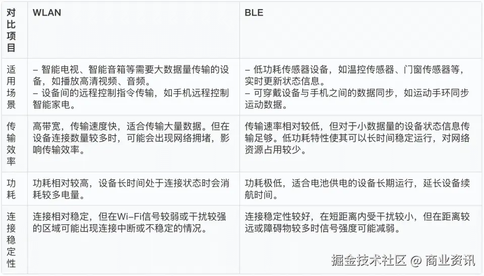 · WLAN 提供了高带宽、稳定的网络连接,适用于大数据量的传输,如智能电视播放高清视频、智能摄像头传输视频流等。而 BLE 则以其低功耗特性,在设备状态更新等小数据量、低频次传输场景中表现出色,两者相辅相成,构建了高效的智能家居数据同步和管理网络。