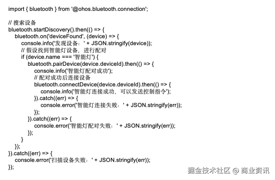 · 当需要对智能设备进行控制或获取更详细信息时,通过蓝牙连接 API 进行设备发现和配对操作。例如,手机 APP 可以搜索并配对智能灯,然后通过蓝牙连接发送控制指令。以下是简单示例代码: