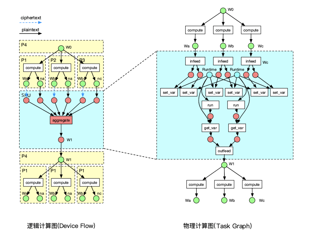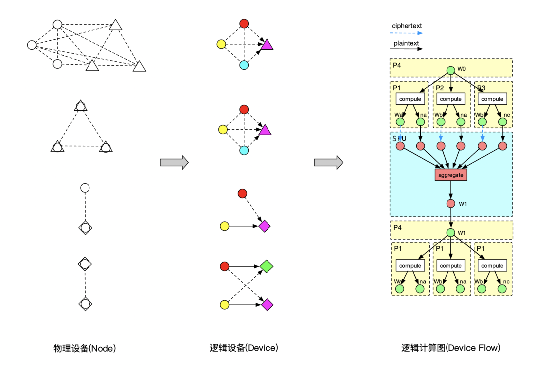 明密文混合调度层: 提供了统一的设备调度抽象,将上层算法描述为一张有向无环图,其中节点表示某个设备上的计算,边表示设备之间的数据流动,即逻辑计算图。逻辑计算图由分布式框架进一步拆分并调度至物理节点。
