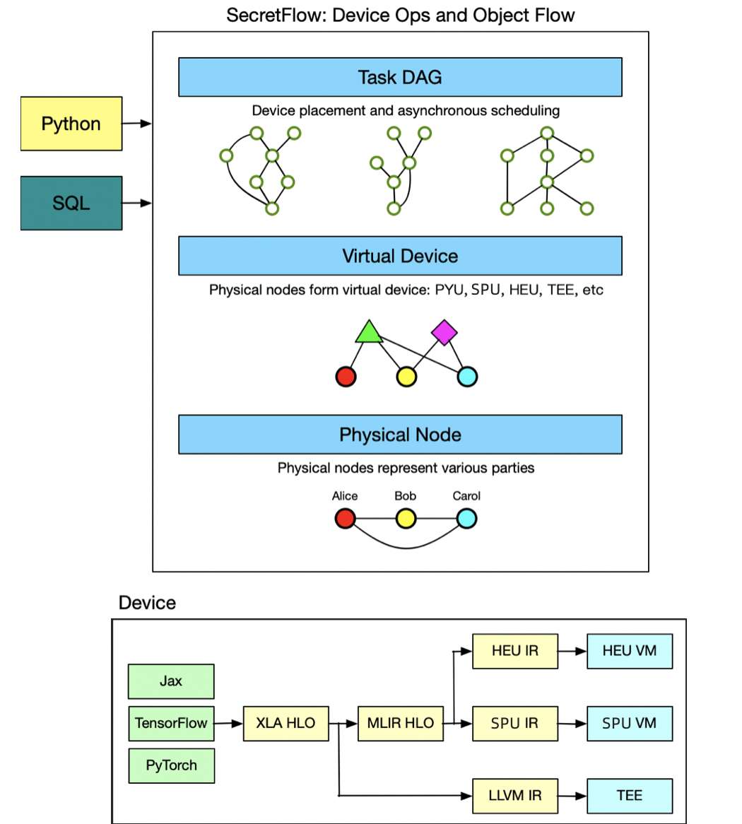 对于密文设备SPU、HEU、TEE,它们的前端可以是任何支持XLA 的框架, 如JAX, TensorFlow,PyTorch等。同样的,用户也可以通过@device将基于这些前端自定义的函数调度至指定的设备执行。